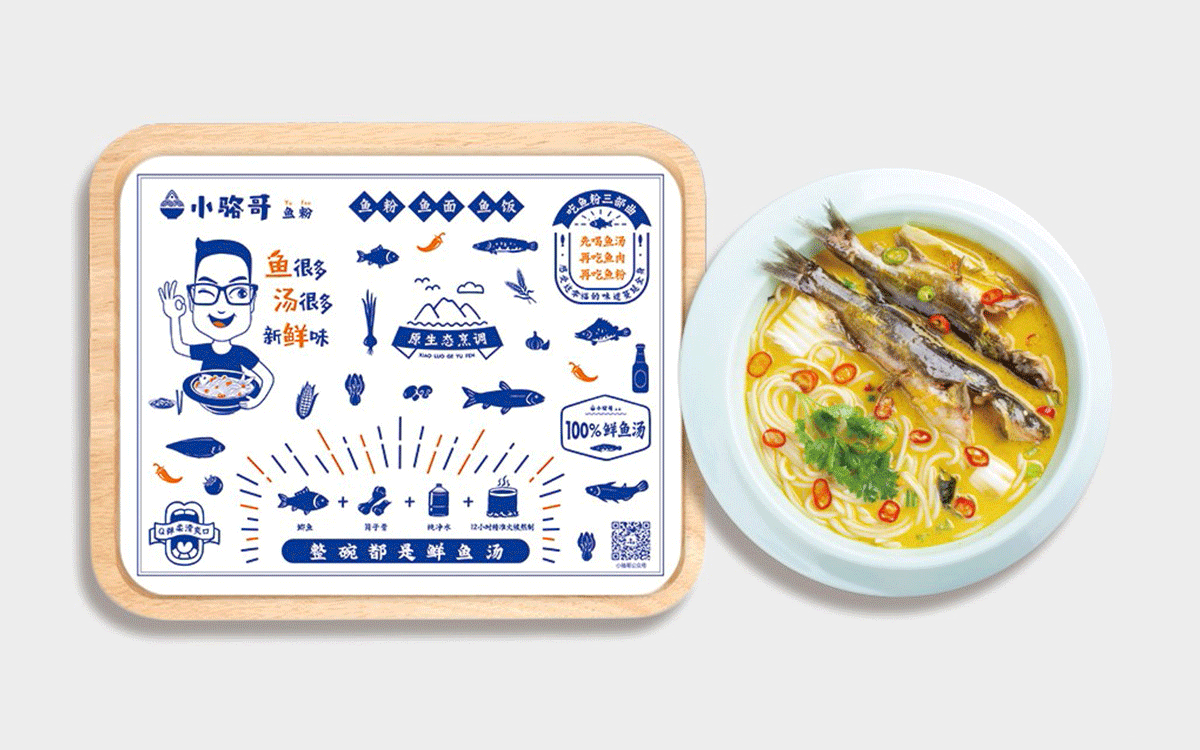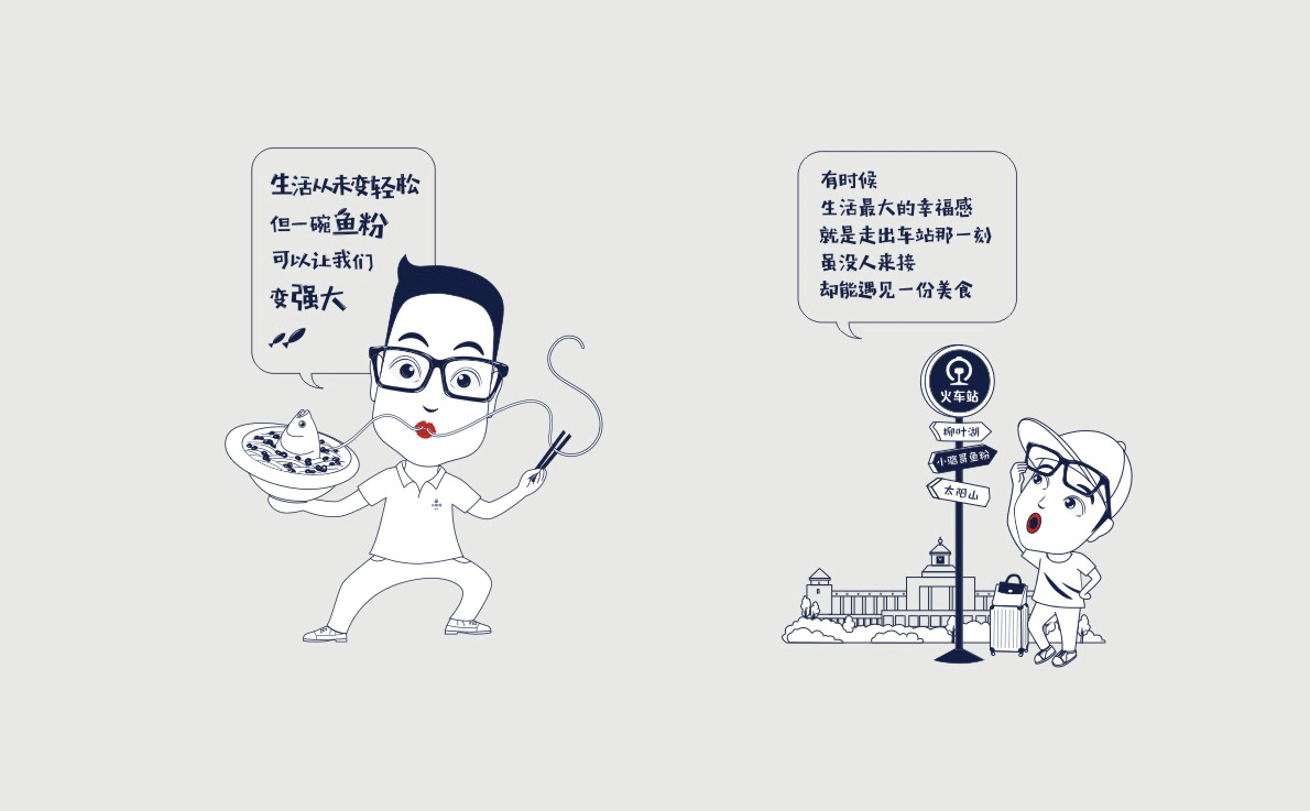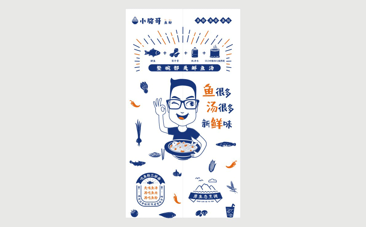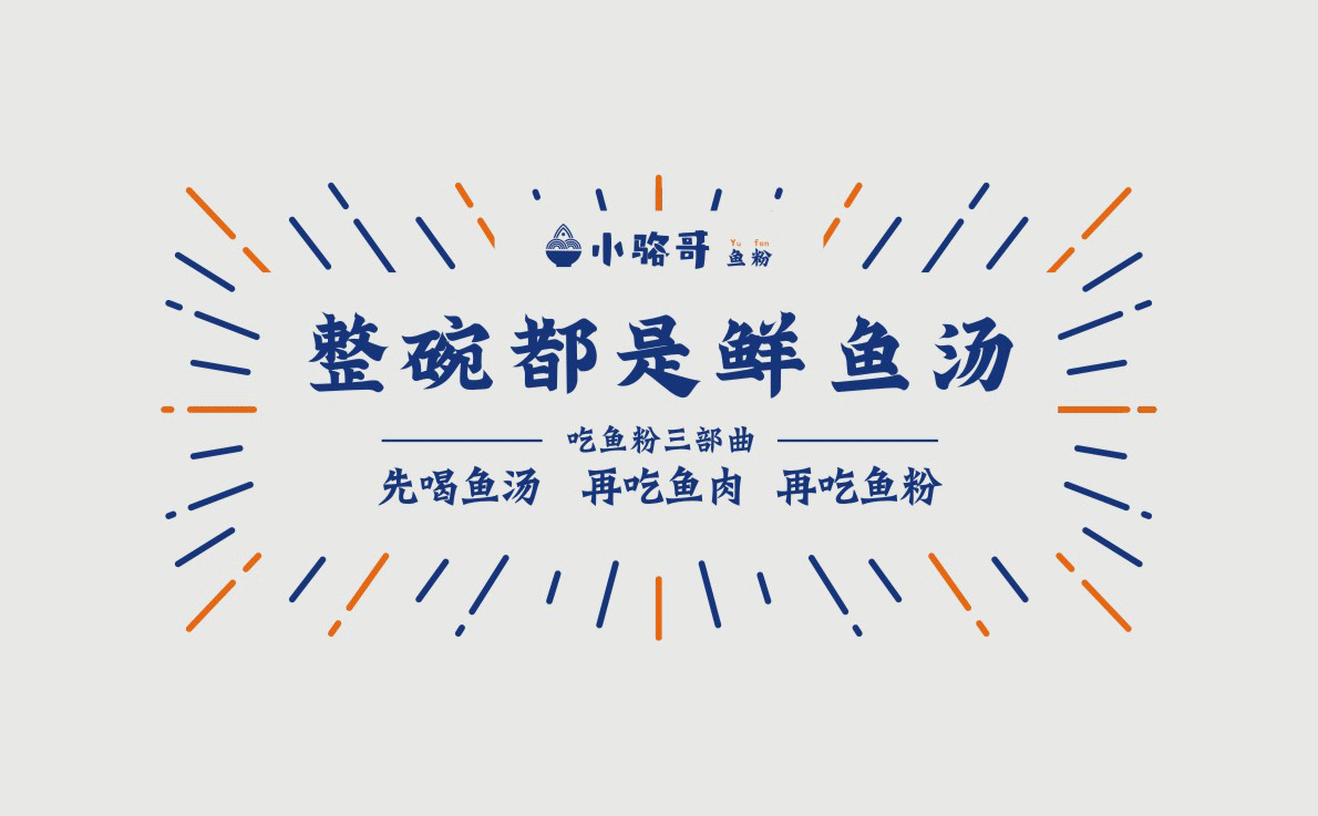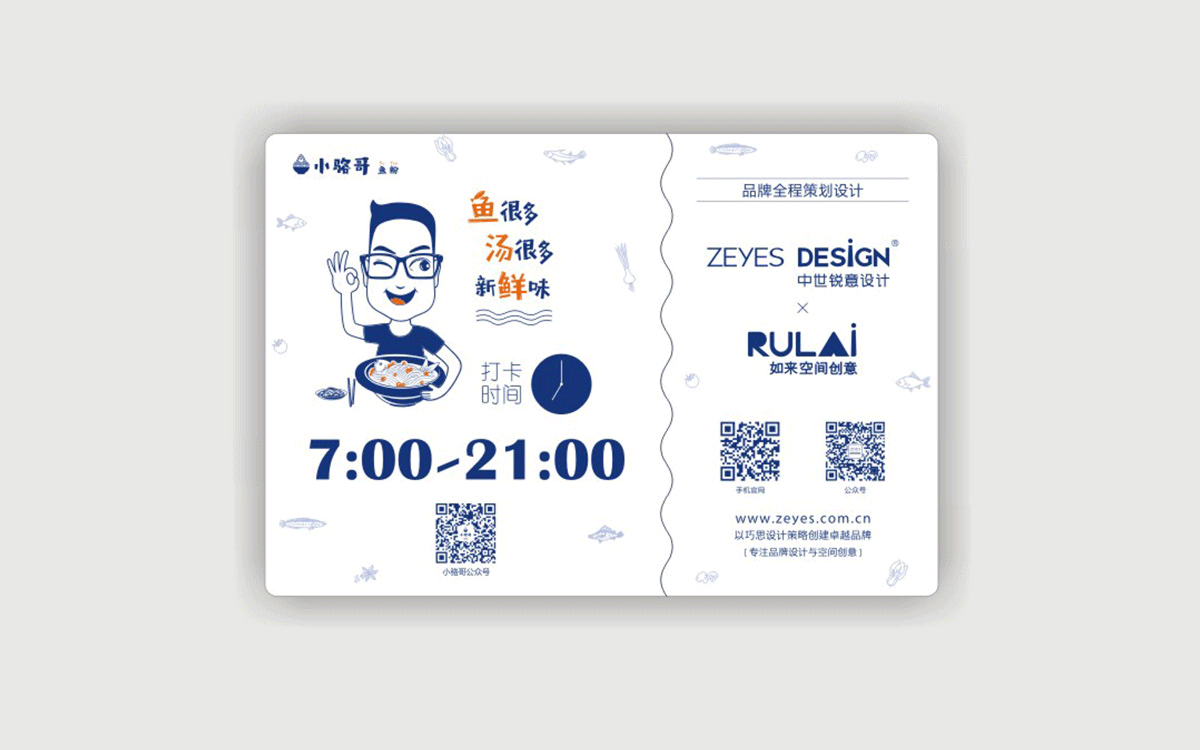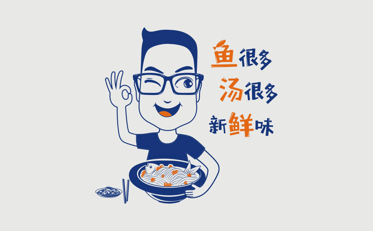 這是2018年中世銳意設(shè)計(jì)接受委托的一個小型輕食餐飲項(xiàng)目,委托人已經(jīng)在當(dāng)?shù)爻晒\(yùn)營了另一個知名度頗高的簡餐品牌——“挑香小面”,這一次重新建立全新品牌,是想拓展餐飲管理公司的產(chǎn)品范圍,并建立更加時尚的輕食品牌。小駱哥魚粉從命名開始,就自帶了濃濃的人情味,用小駱哥本人的昵稱作為品牌名,也展現(xiàn)了委托人對自己產(chǎn)品的自信。人情味與自信結(jié)合、美味與趣味融合,是我們對這個品牌最基本的創(chuàng)作思路。中世銳意設(shè)計(jì)以小駱哥本人為基本原型創(chuàng)作了系列卡通人物插畫;我們創(chuàng)作了系列關(guān)注年輕人學(xué)習(xí)、生活中內(nèi)心波瀾的小段子;我們在空間設(shè)計(jì)中嵌入魚元素的造型,讓小魚空間中游弋,使其成為品牌的超級符號;我們用原生態(tài)實(shí)木設(shè)計(jì)的戶外招牌,展現(xiàn)了濃濃的人情味; 獲得第13屆“創(chuàng)意中國”設(shè)計(jì)大獎賽全國金獎。