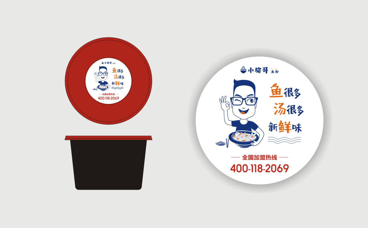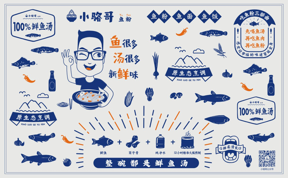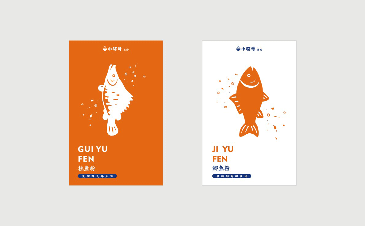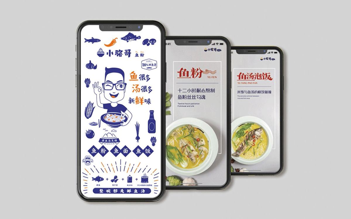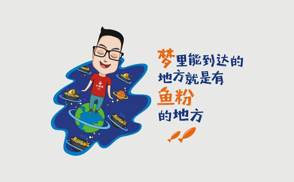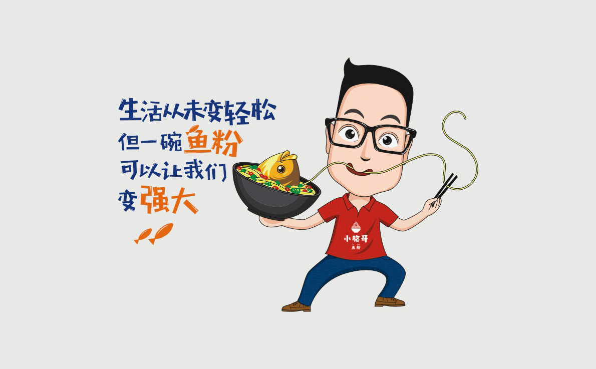 這是2018年中世銳意設(shè)計(jì)接受委托的一個小型輕食餐飲項(xiàng)目,委托人已經(jīng)在當(dāng)?shù)爻晒\(yùn)營了另一個知名度頗高的簡餐品牌——“挑香小面”,這一次重新建立全新品牌,是想拓展餐飲管理公司的產(chǎn)品范圍,并建立更加時尚的輕食品牌。小駱哥魚粉從命名開始,就自帶了濃濃的人情味,用小駱哥本人的昵稱作為品牌名,也展現(xiàn)了委托人對自己產(chǎn)品的自信。人情味與自信結(jié)合、美味與趣味融合,是我們對這個品牌最基本的創(chuàng)作思路。中世銳意設(shè)計(jì)以小駱哥本人為基本原型創(chuàng)作了系列卡通人物插畫;我們創(chuàng)作了系列關(guān)注年輕人學(xué)習(xí)、生活中內(nèi)心波瀾的小段子;我們在空間設(shè)計(jì)中嵌入魚元素的造型,讓小魚空間中游弋,使其成為品牌的超級符號;我們用原生態(tài)實(shí)木設(shè)計(jì)的戶外招牌,展現(xiàn)了濃濃的人情味; 獲得第13屆“創(chuàng)意中國”設(shè)計(jì)大獎賽全國金獎。