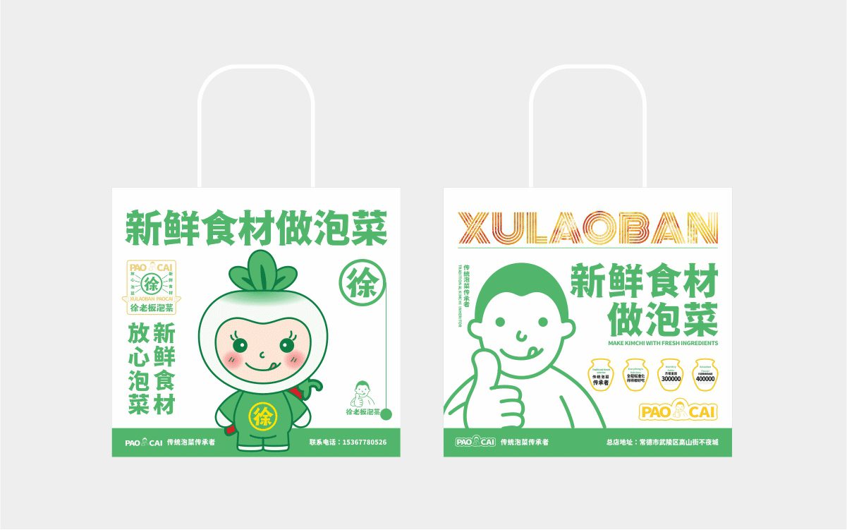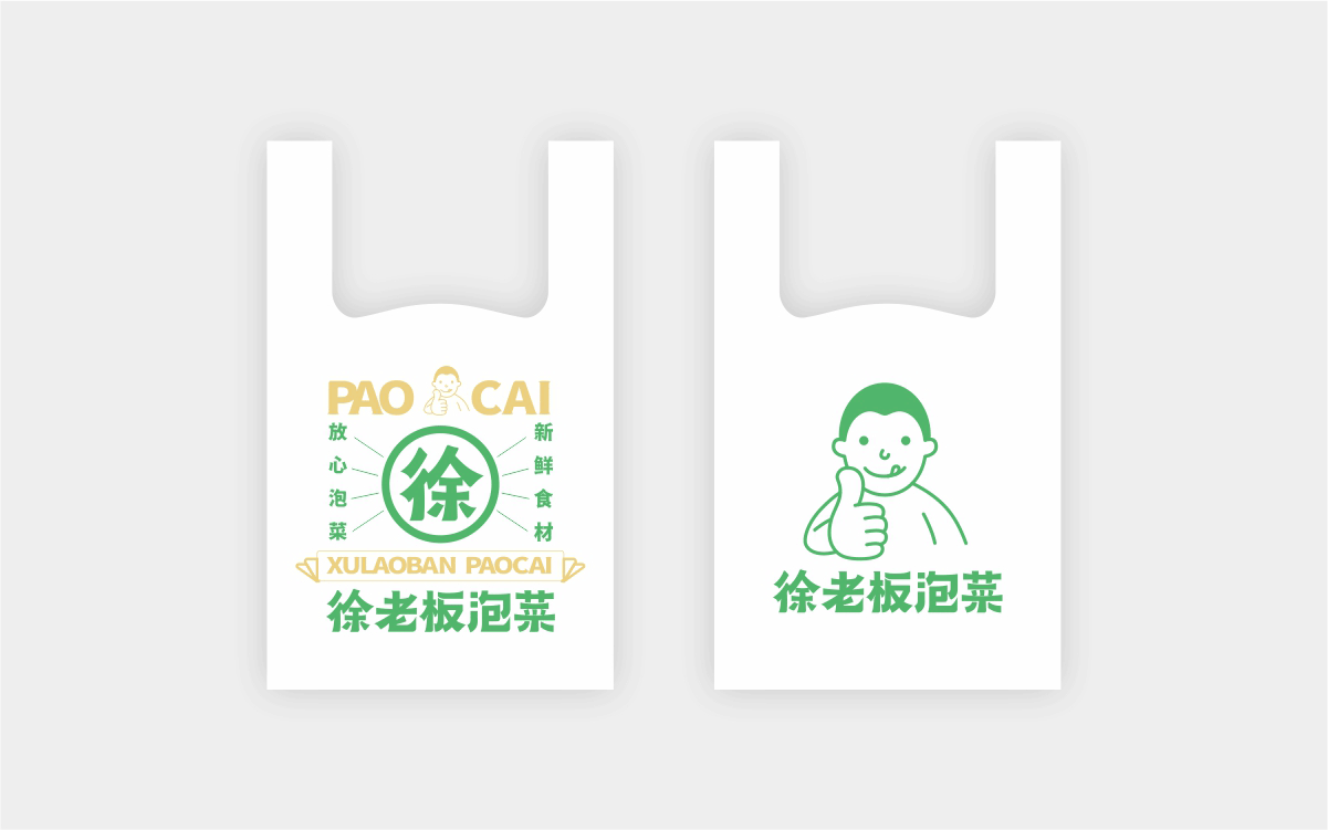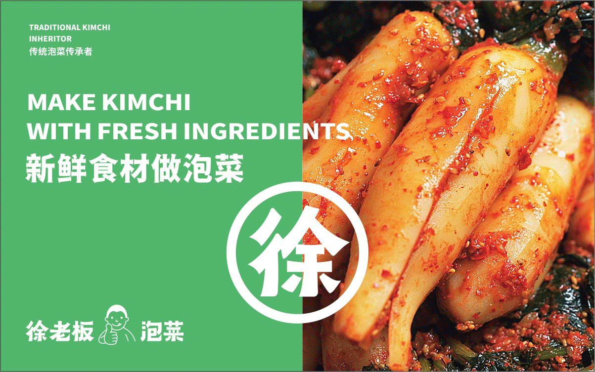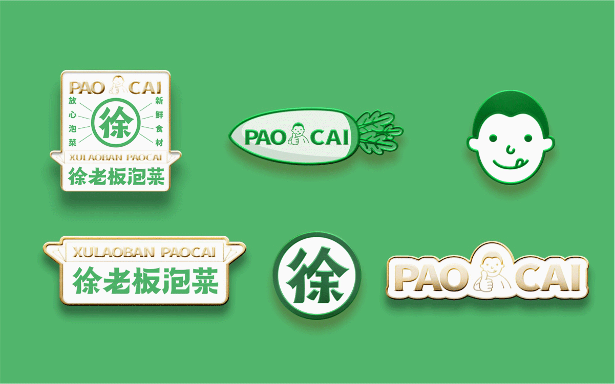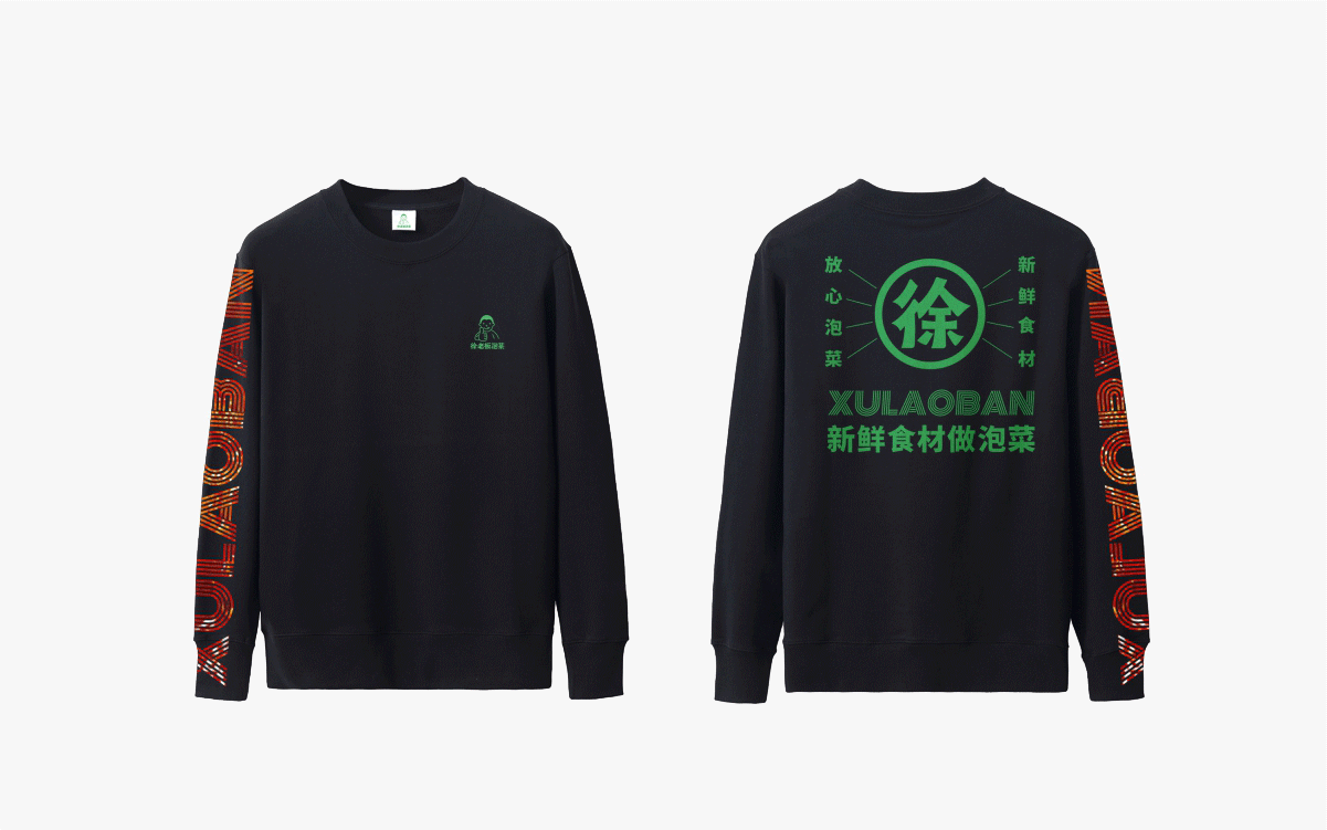 由于徐老板泡菜原有品牌色為綠色,且積累一定人氣和客群,所以在品牌升級(jí)路徑中,我們需要保留品牌綠色的基因,但做色差調(diào)整,配合橙黃色,營(yíng)造出泡菜的酸爽感。