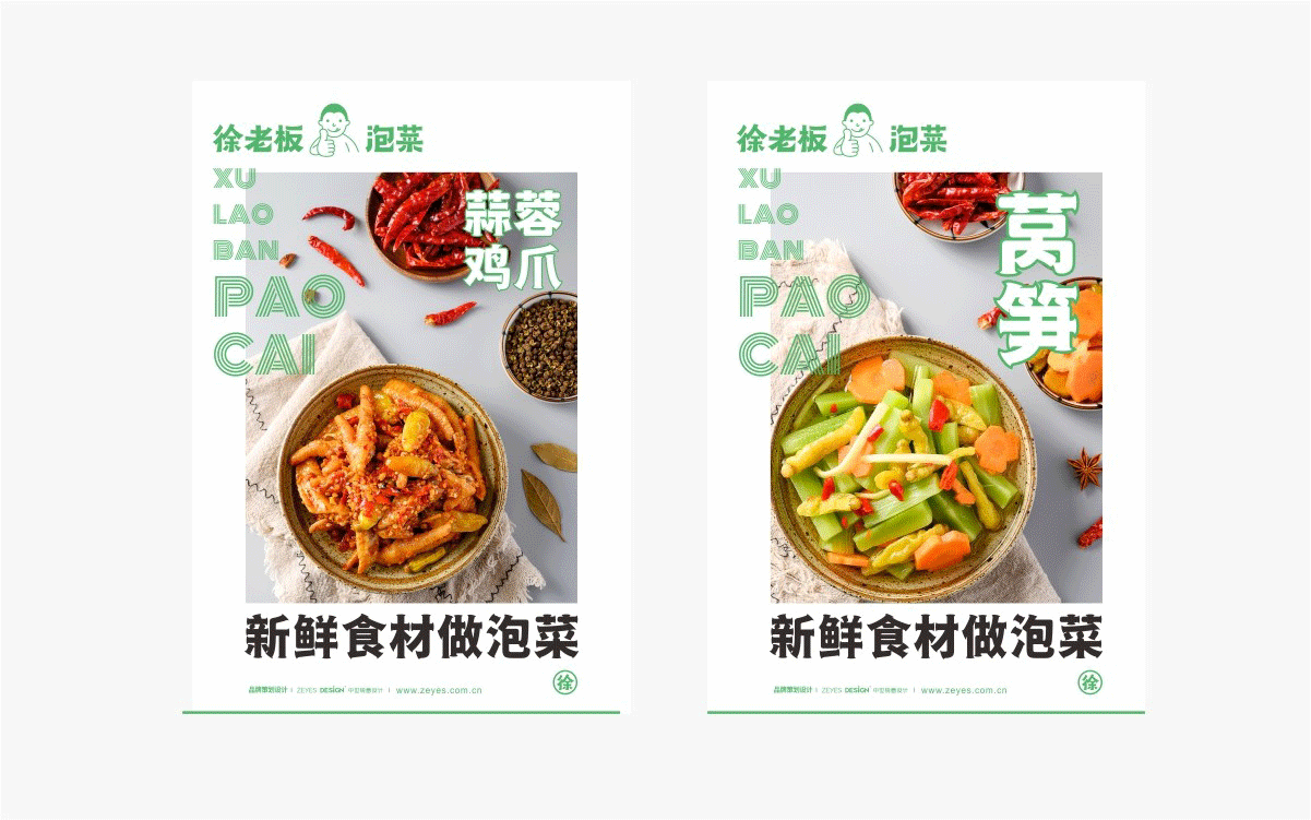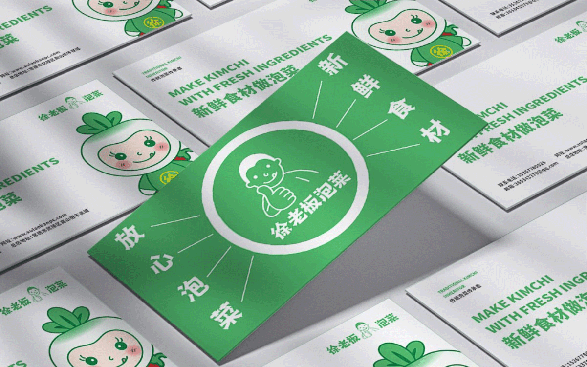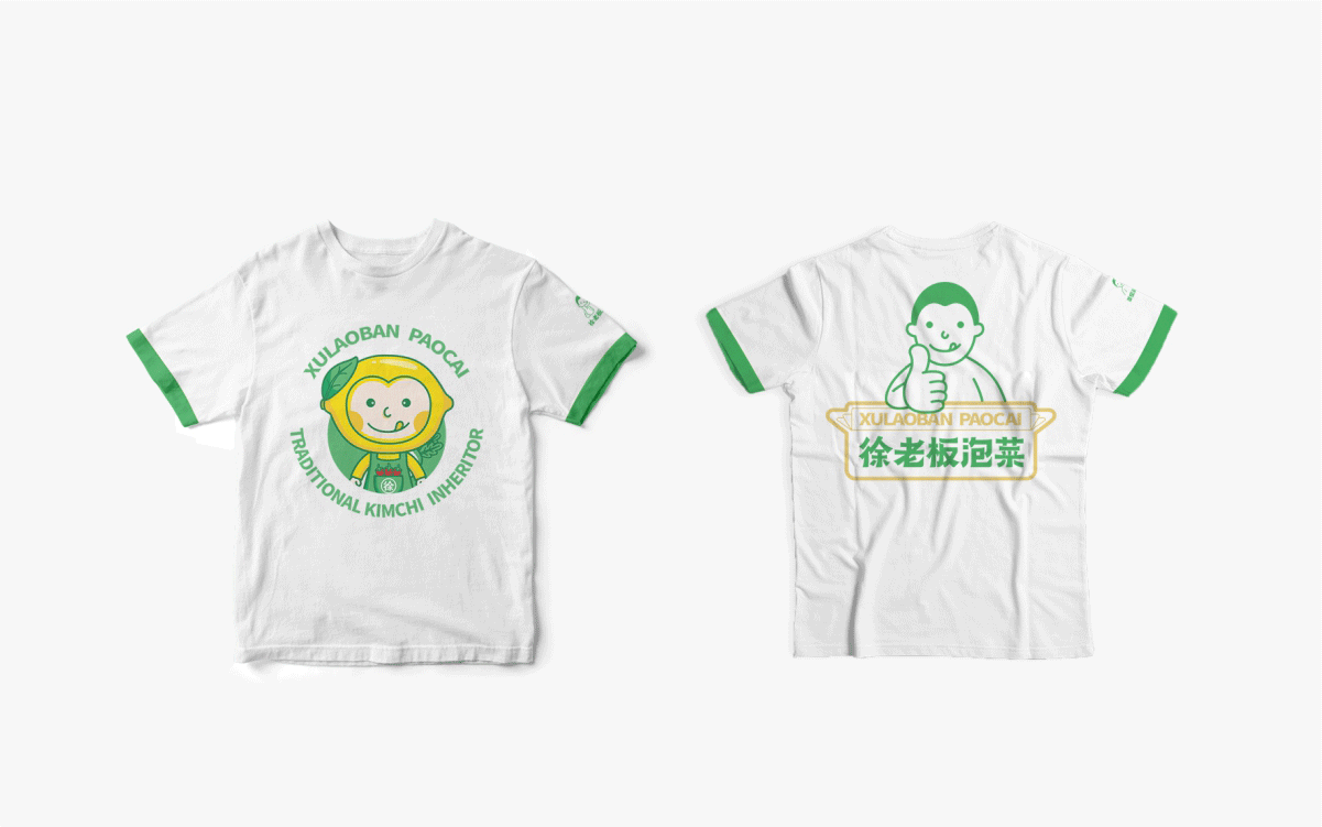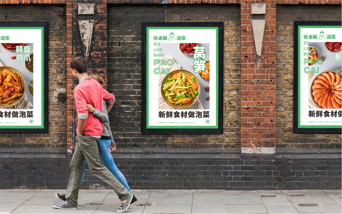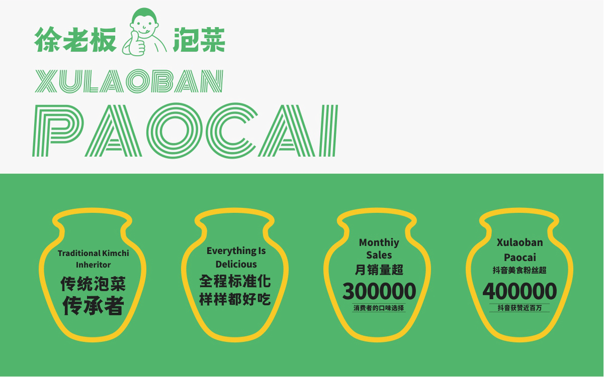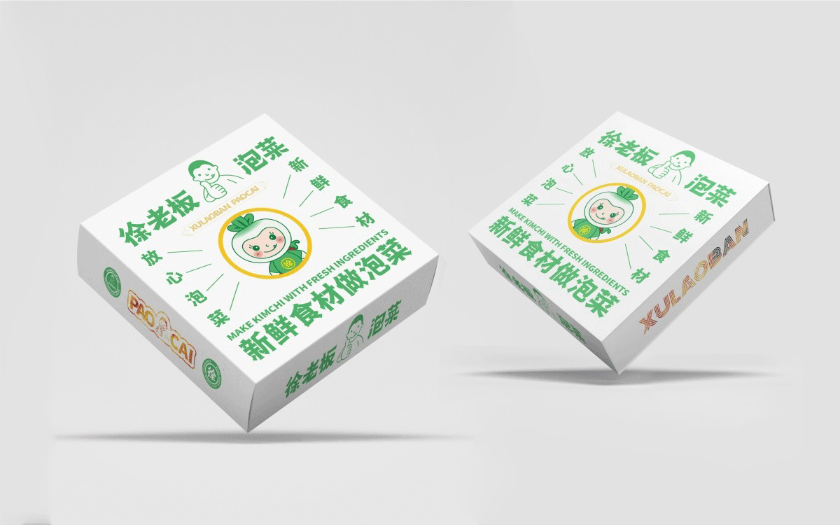 由于徐老板泡菜原有品牌色為綠色,且積累一定人氣和客群,所以在品牌升級(jí)路徑中,我們需要保留品牌綠色的基因,但做色差調(diào)整,配合橙黃色,營(yíng)造出泡菜的酸爽感。