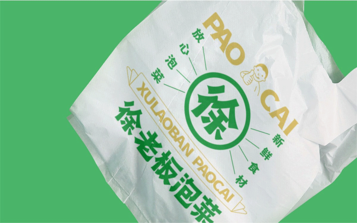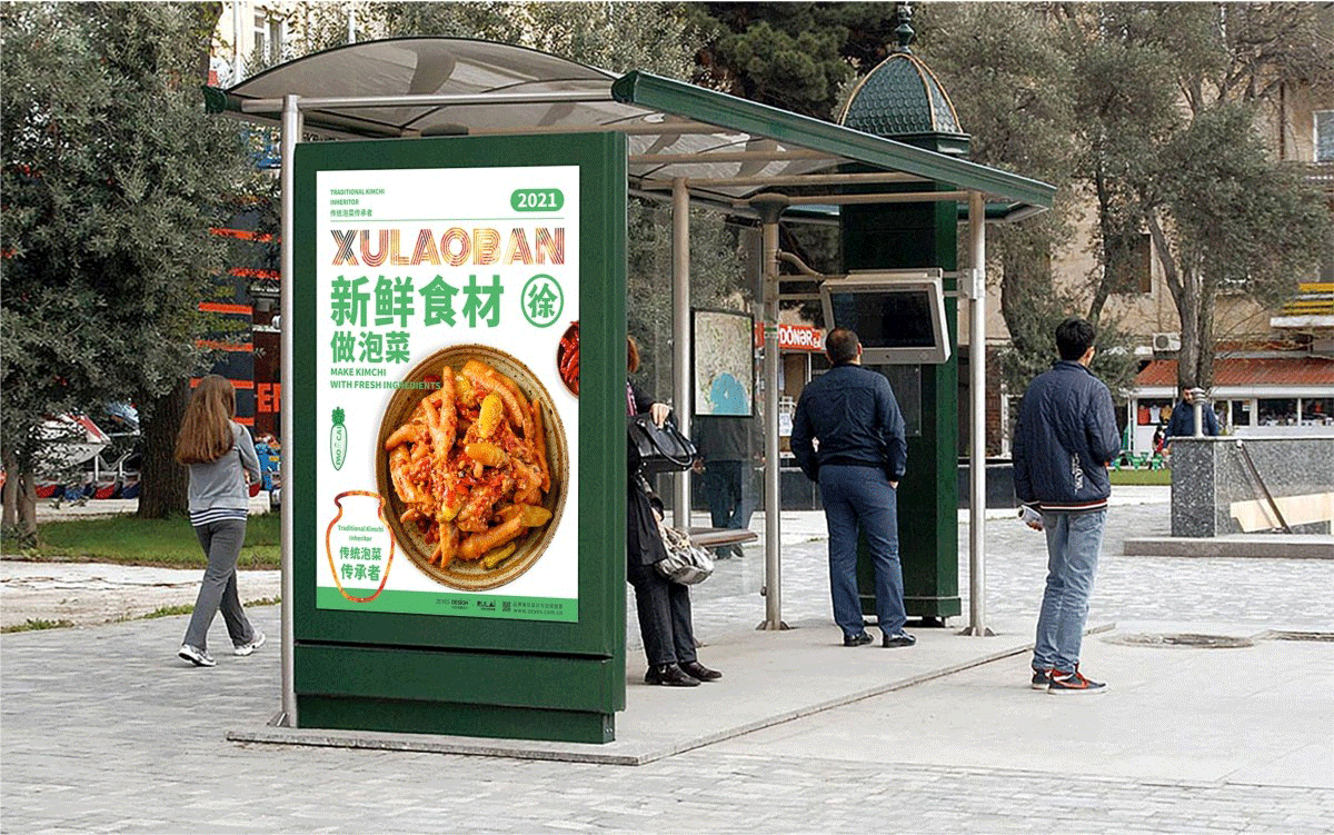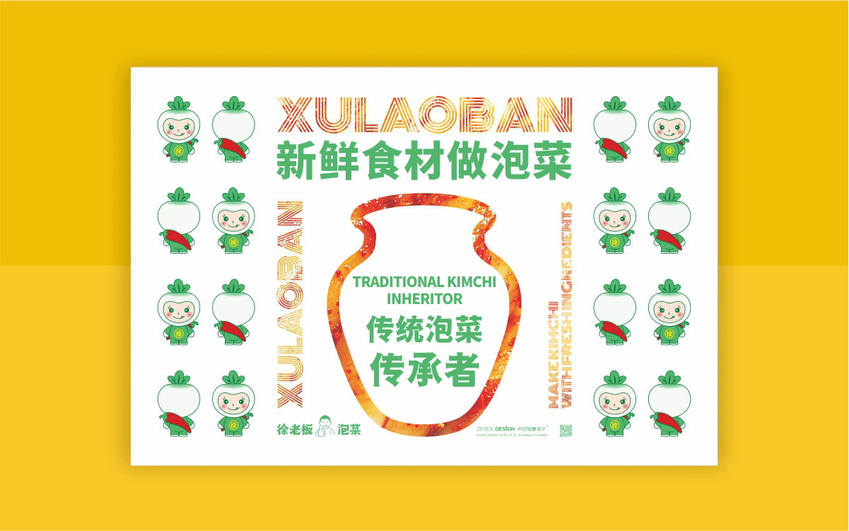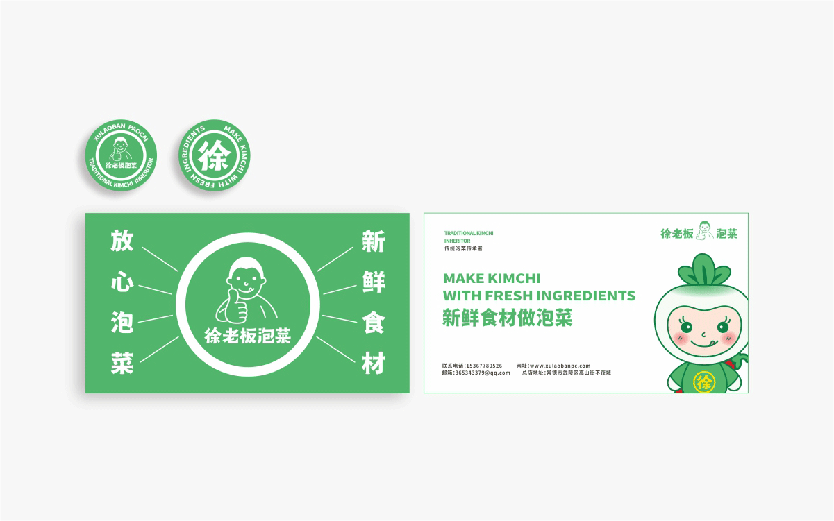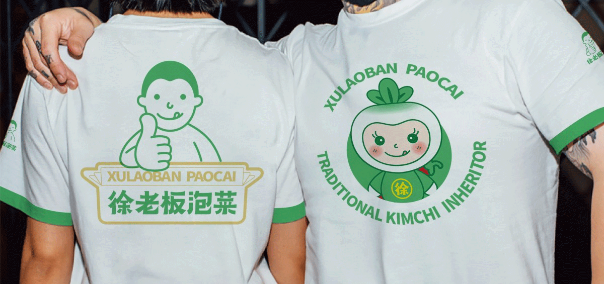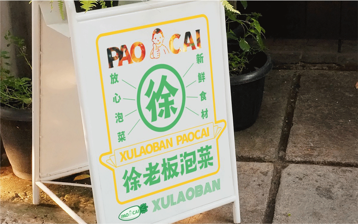 由于徐老板泡菜原有品牌色為綠色,且積累一定人氣和客群,所以在品牌升級(jí)路徑中,我們需要保留品牌綠色的基因,但做色差調(diào)整,配合橙黃色,營(yíng)造出泡菜的酸爽感。