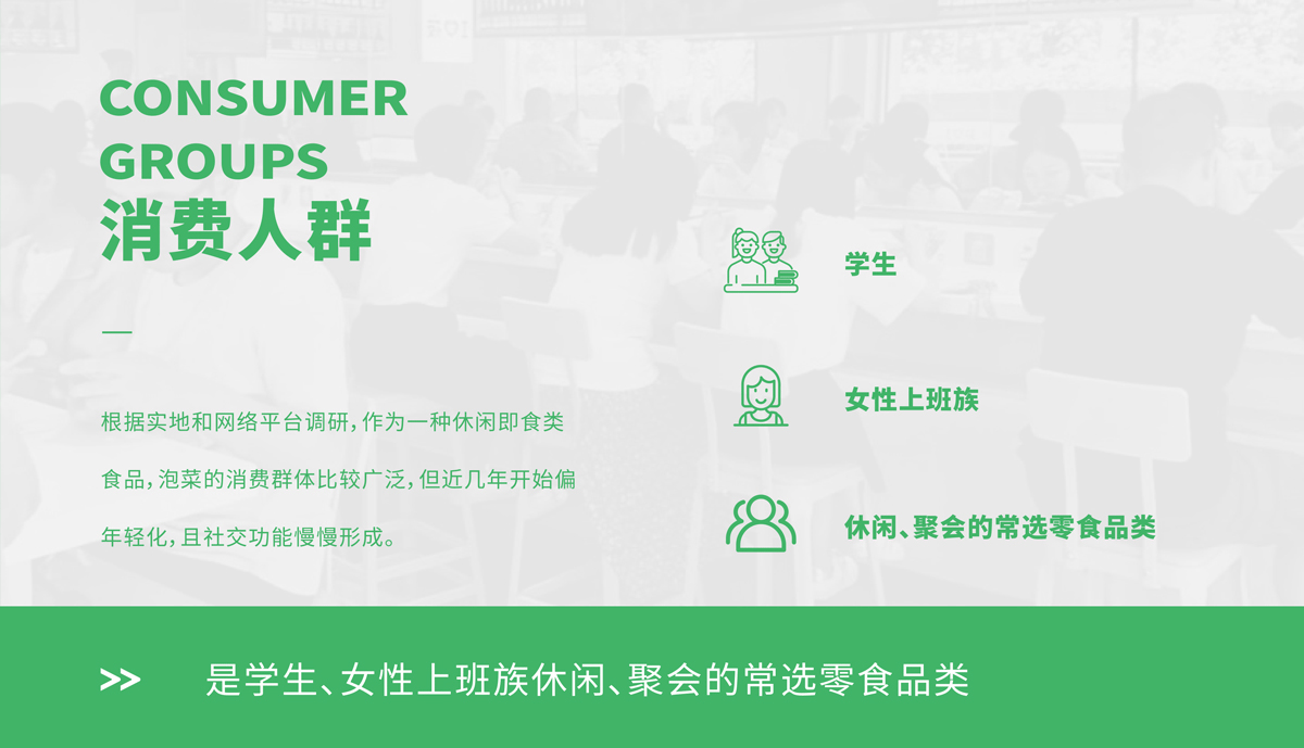 根據(jù)實(shí)地和網(wǎng)絡(luò)平臺(tái)調(diào)研,作為一種休閑即食類食品,泡菜的消費(fèi)群體比較廣泛,但近幾年開(kāi)始偏年輕化,且社交功能慢慢形成。是學(xué)生、女性上班族休閑、